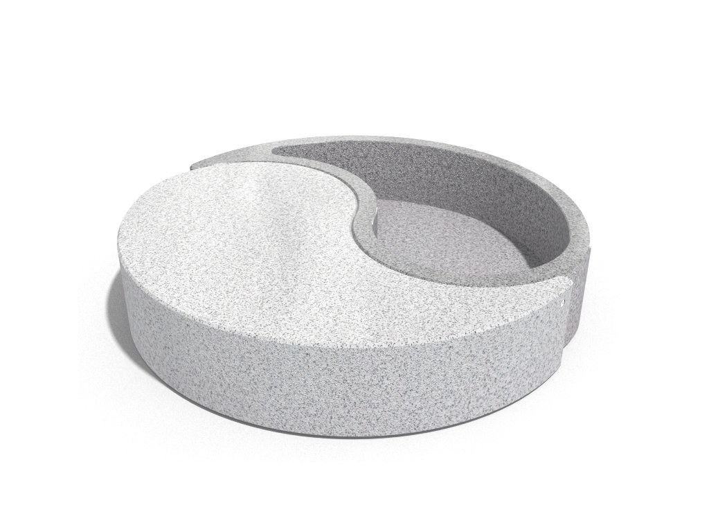 Betonový květináč s lavičkou ze série Yin and Yang. Je vyroben z vysoce odolného betonu s homogenní strukturou kameniva. Struktura kameniva je složena z přírodních mramorových nebo žulových kamenů s definovanou velikostí a možností různých barevných kombinací. Boční plochy jsou reliéfní a sedací plocha je jemně leštěná. Výrobek je ošetřen ochranným nátěrem, který snižuje usazování nečistot a zvyšuje odolnost vůči agresivním povětrnostním podmínkám. Výrobek je dodáván kompletně smontovaný.