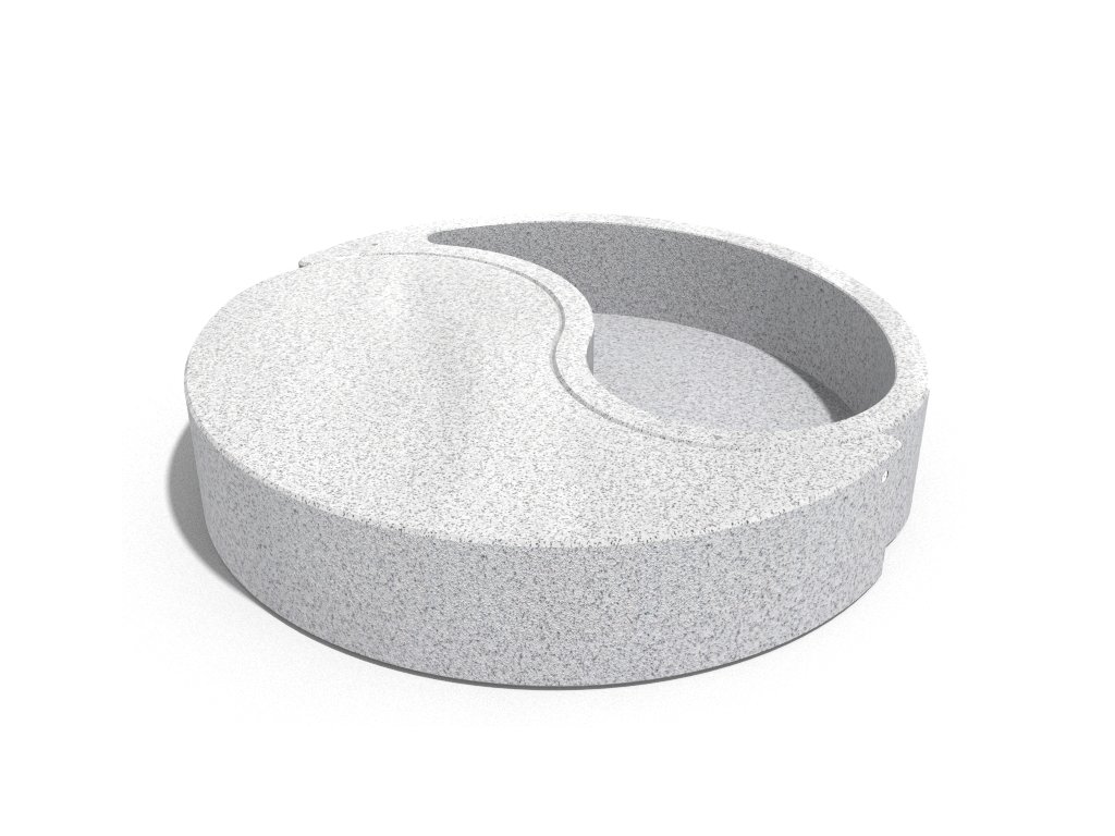 Betonový květináč s lavičkou ze série Yin and Yang. Je vyroben z vysoce odolného betonu s homogenní strukturou kameniva. Struktura kameniva je složena z přírodních mramorových nebo žulových kamenů s definovanou velikostí a možností různých barevných kombinací. Boční plochy jsou reliéfní a sedací plocha je jemně leštěná. Výrobek je ošetřen ochranným nátěrem, který snižuje usazování nečistot a zvyšuje odolnost vůči agresivním povětrnostním podmínkám. Výrobek je dodáván kompletně smontovaný.
