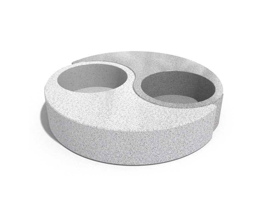Betonový květináč  lavicí ze série Yin and Yang. Je vyroben z vysoce odolného  betonu s homogenní   strukturou  kameniva . Struktura kameniva  se skládá z přírodního mramoru nebo žuly s definovanou velikostí a možností různých barevných kombinací. Boční plochy jsou reliéfní a sedák je jemně leštěný. Výrobek je ošetřen ochranným nátěrem, který snižuje usazování nečistot a zvyšuje odolnost vůči agresivním povětrnostním podmínkám. Výrobek je dodáván kompletně smontovaný.