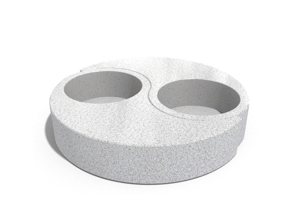 Betonový květináč  lavicí ze série Yin and Yang. Je vyroben z vysoce odolného  betonu s homogenní   strukturou  kameniva . Struktura kameniva  se skládá z přírodního mramoru nebo žuly s definovanou velikostí a možností různých barevných kombinací. Boční plochy jsou reliéfní a sedák je jemně leštěný. Výrobek je ošetřen ochranným nátěrem, který snižuje usazování nečistot a zvyšuje odolnost vůči agresivním povětrnostním podmínkám. Výrobek je dodáván kompletně smontovaný.