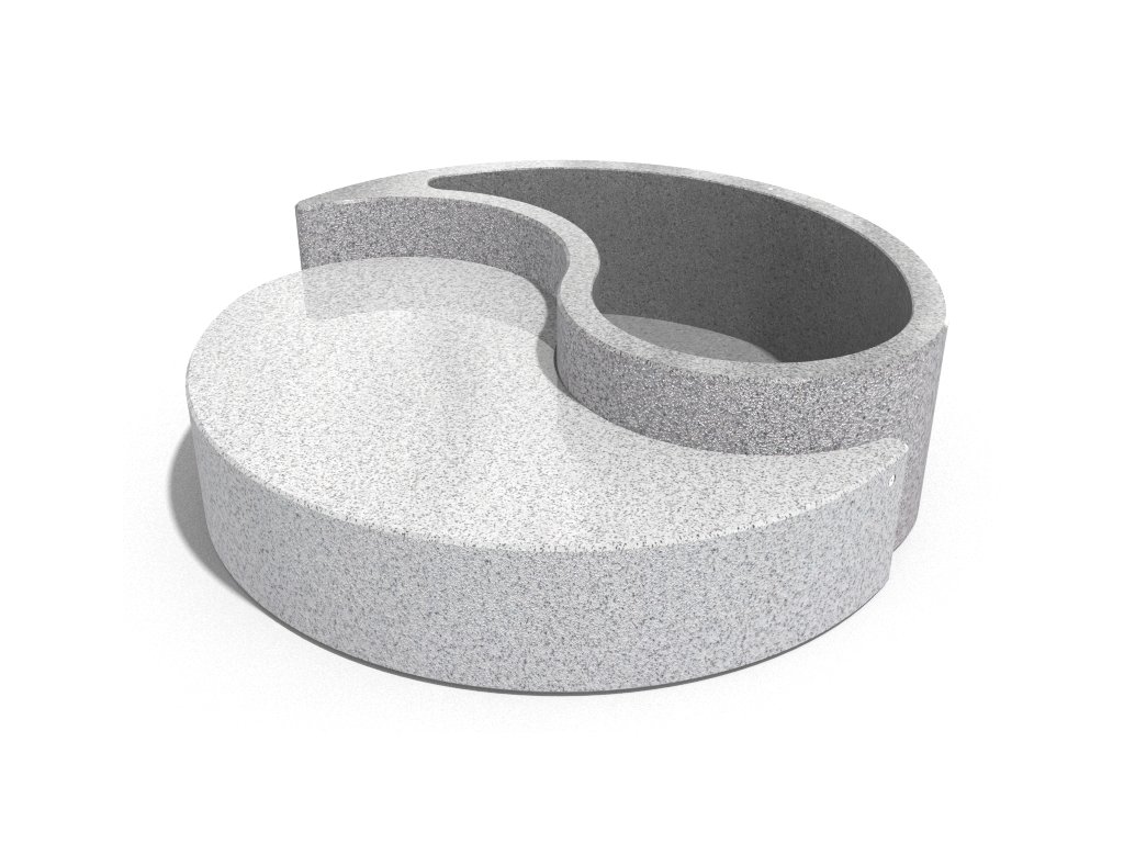 Betonový květináč s lavicí ze série Yin and Yang. Je vyroben z vysoce odolného betonu s homogenní strukturou kameniva . Struktura kameniva se skládá z přírodního mramoru nebo žuly s definovanou velikostí a možností různých barevných kombinací. Boční plochy jsou reliéfní a sedák je jemně leštěný. Výrobek je ošetřen ochranným nátěrem, který snižuje usazování nečistot a zvyšuje odolnost vůči agresivním povětrnostním podmínkám. Výrobek je dodáván kompletně smontovaný.