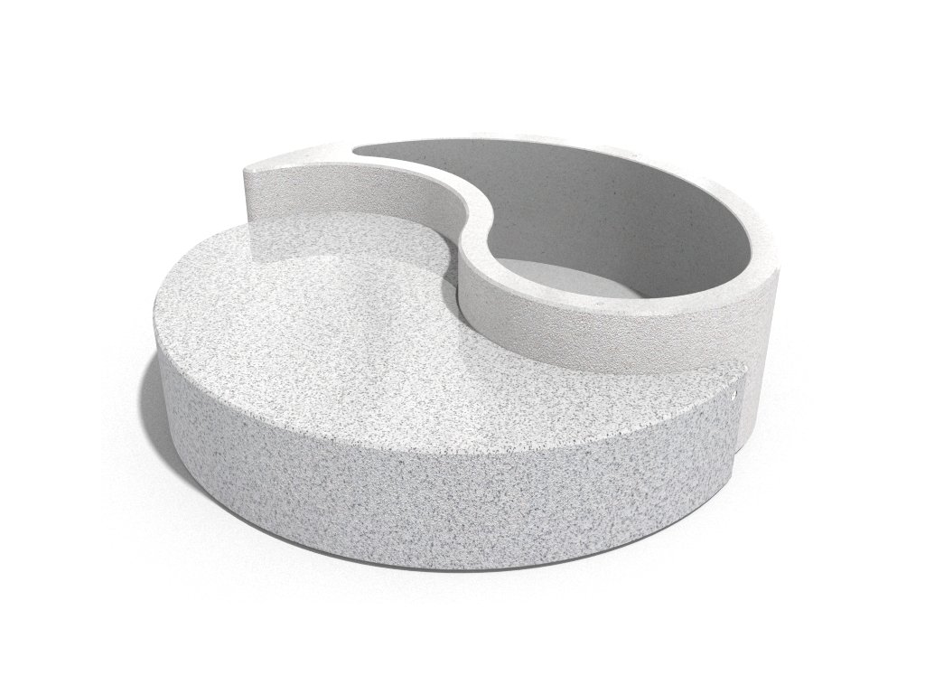 Betonový květináč  lavicí ze série Yin and Yang. Je vyroben z vysoce odolného  betonu s homogenní   strukturou  kameniva . Struktura kameniva  se skládá z přírodního mramoru nebo žuly s definovanou velikostí a možností různých barevných kombinací. Boční plochy jsou reliéfní a sedák je jemně leštěný. Výrobek je ošetřen ochranným nátěrem, který snižuje usazování nečistot a zvyšuje odolnost vůči agresivním povětrnostním podmínkám. Výrobek je dodáván kompletně smontovaný.