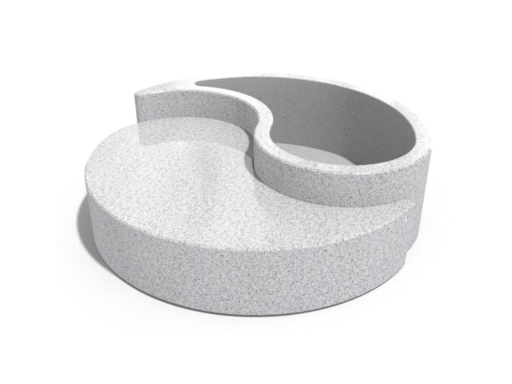 Betonový květináč  lavicí ze série Yin and Yang. Je vyroben z vysoce odolného  betonu s homogenní   strukturou  kameniva . Struktura kameniva  se skládá z přírodního mramoru nebo žuly s definovanou velikostí a možností různých barevných kombinací. Boční plochy jsou reliéfní a sedák je jemně leštěný. Výrobek je ošetřen ochranným nátěrem, který snižuje usazování nečistot a zvyšuje odolnost vůči agresivním povětrnostním podmínkám. Výrobek je dodáván kompletně smontovaný.