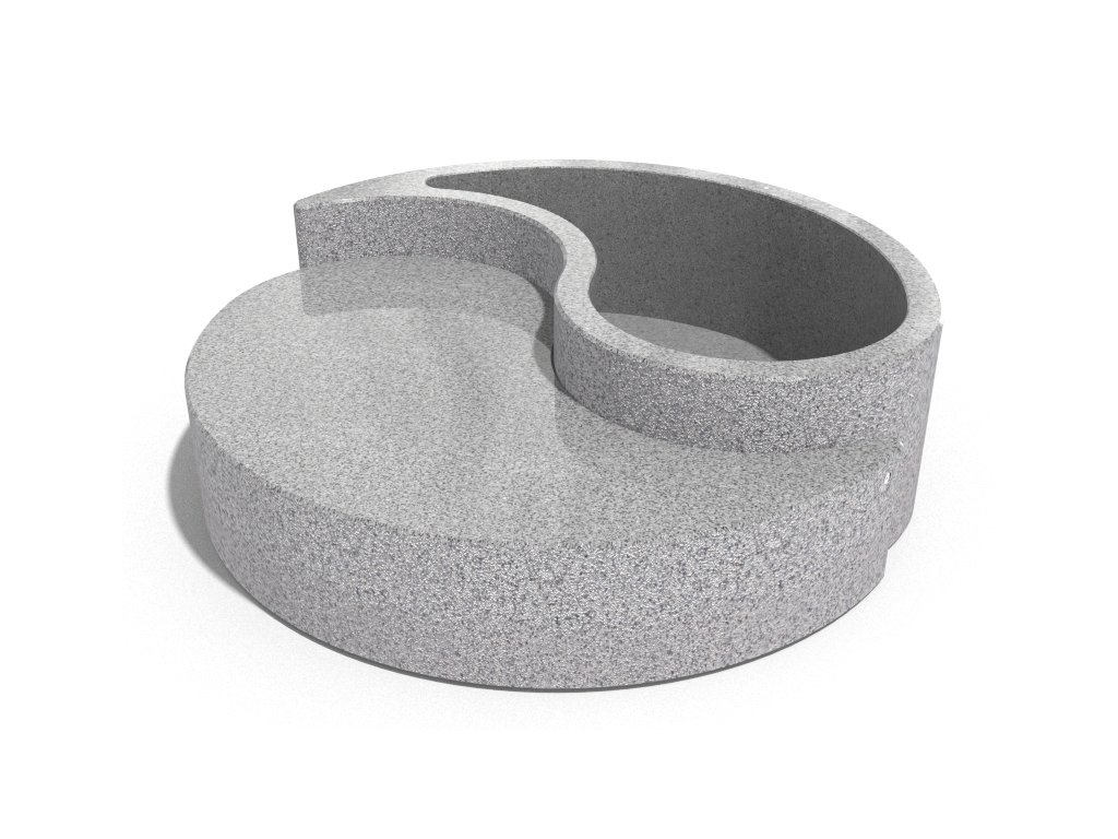 Betonový květináč  lavicí ze série Yin and Yang. Je vyroben z vysoce odolného  betonu s homogenní   strukturou  kameniva . Struktura kameniva  se skládá z přírodního mramoru nebo žuly s definovanou velikostí a možností různých barevných kombinací. Boční plochy jsou reliéfní a sedák je jemně leštěný. Výrobek je ošetřen ochranným nátěrem, který snižuje usazování nečistot a zvyšuje odolnost vůči agresivním povětrnostním podmínkám. Výrobek je dodáván kompletně smontovaný.