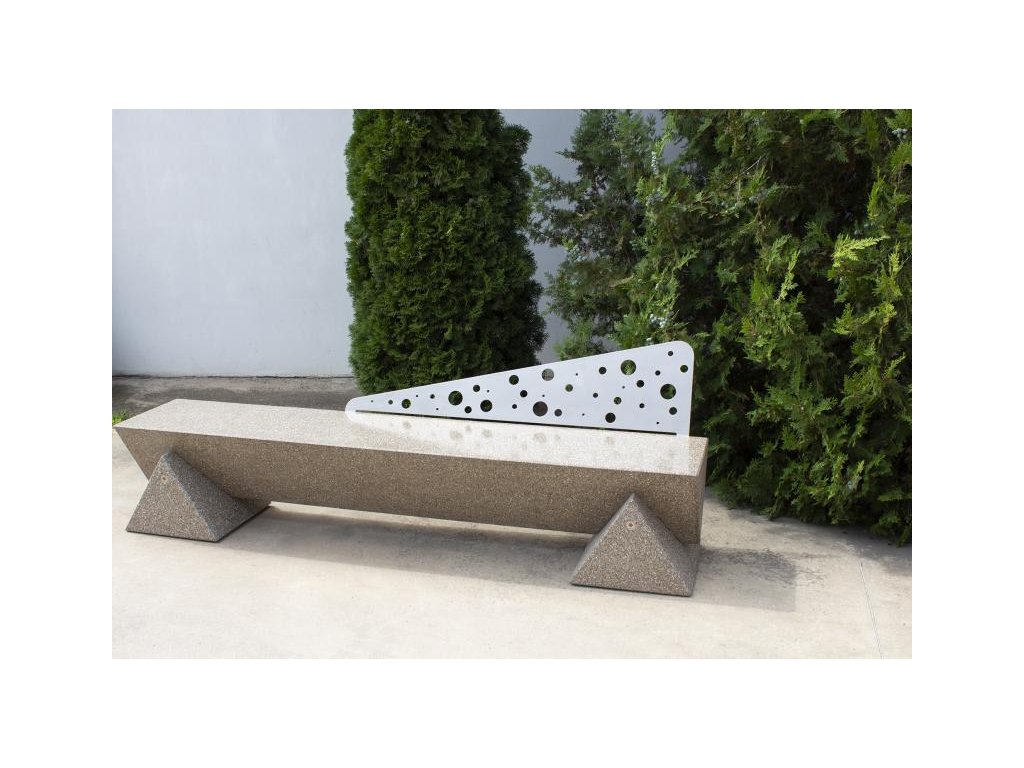 Betonová lavička s opěradlem vyrobená z vysoce odolného vyztuženého vláknobetonu s kamenivem z přírodního mramoru nebo žuly, v různých barevných kombinacích. Všechny povrchy jsou leštěny a opatřeny dalším ochranným nátěrem, díky kterému je výrobek ještě odolnější vůči agresivním povětrnostním podmínkám, snižuje usazování nečistot a zlepšuje hydrofobní vlastnosti betonu. Opěradlo je vyrobeno z nerezové oceli. Čistý geometrický tvar a jemné linie umožňují eleganci lavičky vytvářet ještě krásnější městské prostory.