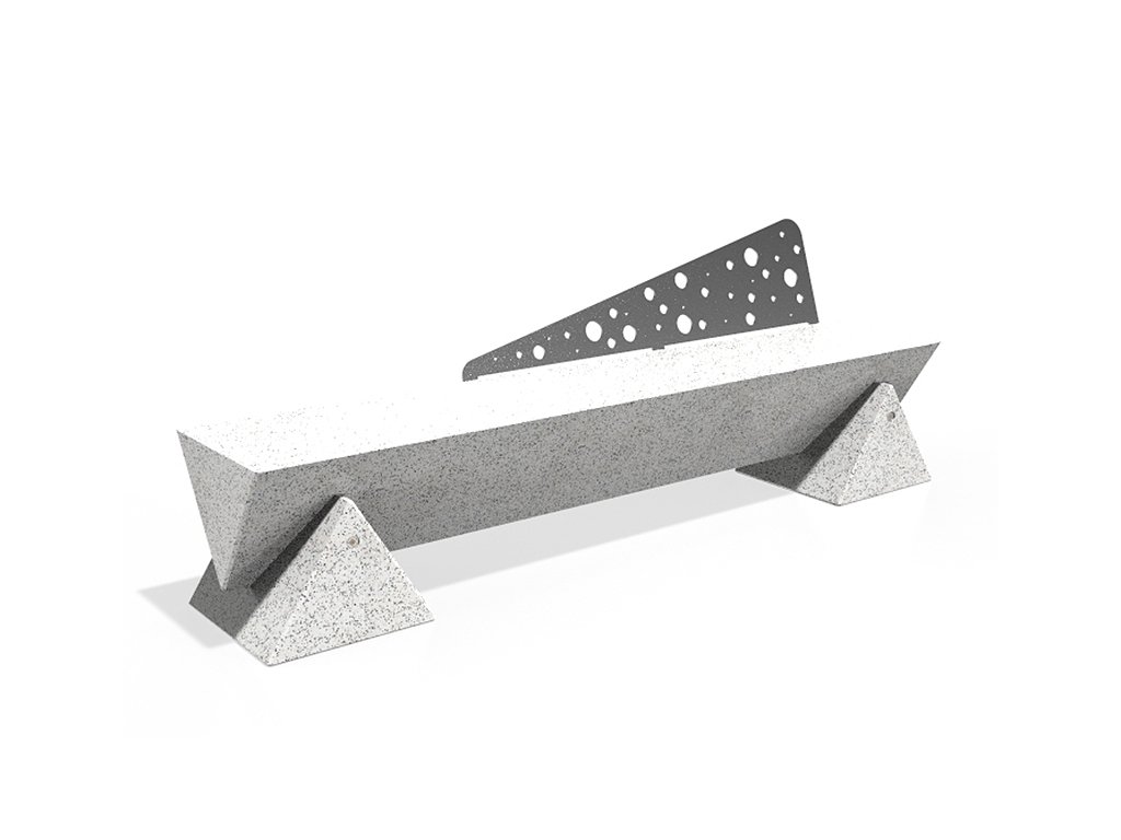 Betonová lavička s opěradlem vyrobená z vysoce odolného vyztuženého vláknobetonu s kamenivem z přírodního mramoru nebo žuly, v různých barevných kombinacích. Všechny povrchy jsou leštěny a opatřeny dalším ochranným nátěrem, díky kterému je výrobek ještě odolnější vůči agresivním povětrnostním podmínkám, snižuje usazování nečistot a zlepšuje hydrofobní vlastnosti betonu. Opěradlo je vyrobeno z nerezové oceli. Čistý geometrický tvar a jemné linie umožňují eleganci lavičky vytvářet ještě krásnější městské prostory.