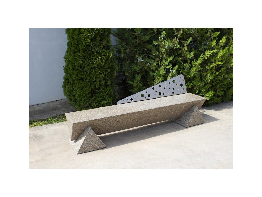 Betonová lavička s opěradlem vyrobená z vysoce odolného vyztuženého vláknobetonu s kamenivem z přírodního mramoru nebo žuly, v různých barevných kombinacích. Všechny povrchy jsou leštěny a opatřeny dalším ochranným nátěrem, díky kterému je výrobek ještě odolnější vůči agresivním povětrnostním podmínkám, snižuje usazování nečistot a zlepšuje hydrofobní vlastnosti betonu. Opěradlo je vyrobeno z nerezové oceli. Čistý geometrický tvar a jemné linie umožňují eleganci lavičky vytvářet ještě krásnější městské prostory.