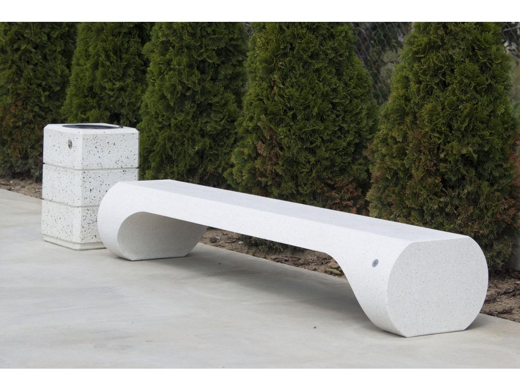 Betonová lavička vyrobená z vysoce odolného vyztuženého vláknobetonu a přírodního kameniva z mramoru nebo žuly, v různých barevných kombinacích.