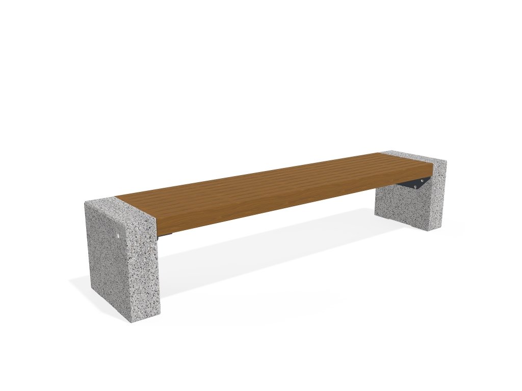 Betonová lavice s opěradlem a sedákem vyrobená z certifikovaného dřeva. Nohy jsou vyrobeny z vysoce odolného vyztuženého vláknobetonu a přírodního kameniva. Struktura kameniva je kombinací přírodních mramorových nebo žulových kamenů určité velikosti v různých barevných kombinacích. Betonový povrch má charakteristický jemný reliéf. Přidání ochranného nátěru na betonové a dřevěné komponenty činí výrobek ještě odolnějším vůči agresivním povětrnostním podmínkám. Lavice, která v sobě spojuje univerzální vitalitu moderního městského života a hodí se do jakéhokoli krajinářského designu.