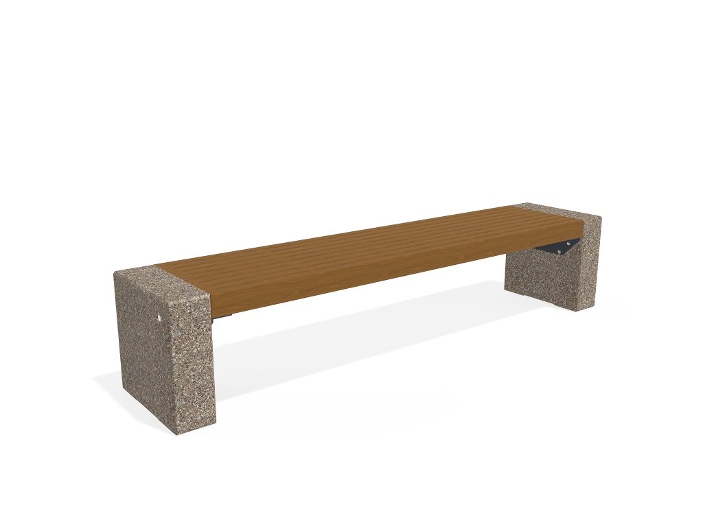 Betonová lavice s opěradlem a sedákem vyrobená z certifikovaného dřeva. Nohy jsou vyrobeny z vysoce odolného vyztuženého vláknobetonu a přírodního kameniva. Struktura kameniva je kombinací přírodních mramorových nebo žulových kamenů určité velikosti v různých barevných kombinacích. Betonový povrch má charakteristický jemný reliéf. Přidání ochranného nátěru na betonové a dřevěné komponenty činí výrobek ještě odolnějším vůči agresivním povětrnostním podmínkám. Lavice, která v sobě spojuje univerzální vitalitu moderního městského života a hodí se do jakéhokoli krajinářského designu.
