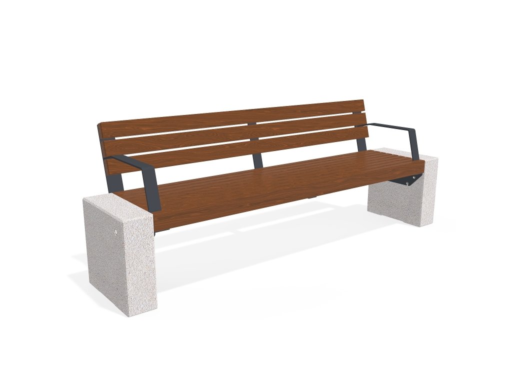 Betonová lavice s opěradlem a sedákem vyrobená z certifikovaného dřeva. Nohy jsou vyrobeny z vysoce odolného vyztuženého vláknobetonu a přírodního kameniva. Struktura kameniva je kombinací přírodních mramorových nebo žulových kamenů určité velikosti v různých barevných kombinacích. Betonový povrch má charakteristický jemný reliéf. Přidání ochranného nátěru na betonové a dřevěné komponenty činí výrobek ještě odolnějším vůči agresivním povětrnostním podmínkám. Lavice, která v sobě spojuje univerzální vitalitu moderního městského života a hodí se do jakéhokoli krajinářského designu.