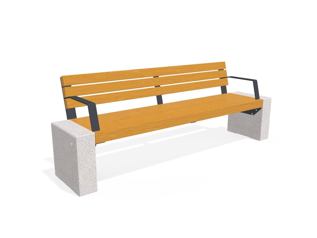 Betonová lavice s opěradlem a sedákem vyrobená z certifikovaného dřeva. Nohy jsou vyrobeny z vysoce odolného vyztuženého vláknobetonu a přírodního kameniva. Struktura kameniva je kombinací přírodních mramorových nebo žulových kamenů určité velikosti v různých barevných kombinacích. Betonový povrch má charakteristický jemný reliéf. Přidání ochranného nátěru na betonové a dřevěné komponenty činí výrobek ještě odolnějším vůči agresivním povětrnostním podmínkám. Lavice, která v sobě spojuje univerzální vitalitu moderního městského života a hodí se do jakéhokoli krajinářského designu.