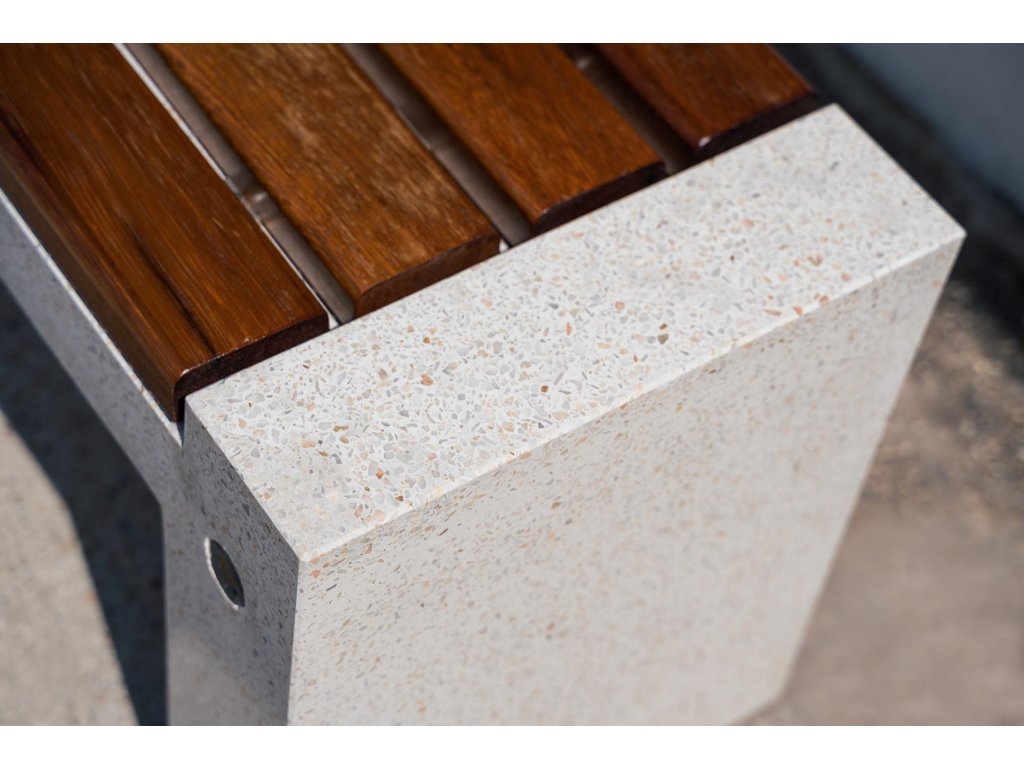 Tento model lavičky je součástí produktové řady orientované na otevřené městské prostory. Elegantní rozšíření betonové lavičky modelu 157 v kombinaci s teplem certifikovaného dřeva. Lavička je vyrobena z vysoce odolného vyztuženého vláknobetonu a přírodního kameniva. Konstrukce je provedena v různých barevných kombinacích a skládá se z přírodního mramoru nebo žuly. Sedací plocha je speciálně navržena a neumožňuje zadržování vody pod dřevěnými prvky. Toto technické řešení a ochranný nátěr dřevěných prken prodlužuje jejich životnost a zabraňuje jejich hnilobě. Všechny betonové povrchy jsou leštěny a lakovány, což činí výrobek ještě odolnějším vůči agresivním povětrnostním podmínkám. Praktické řešení pro moderní městské prostory.