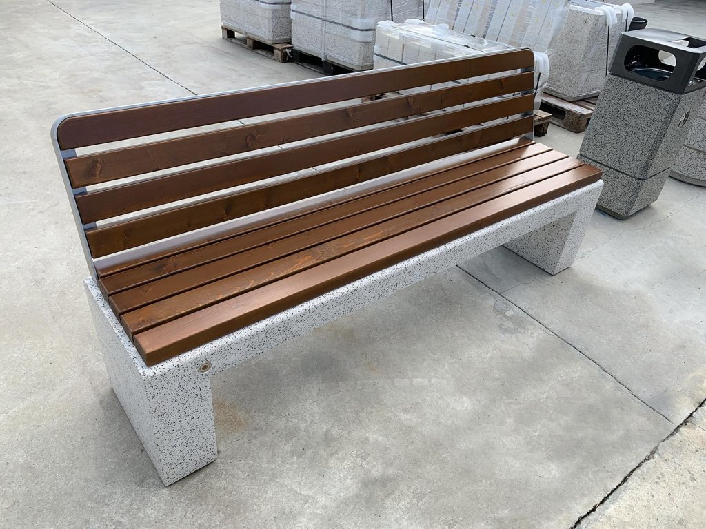 Lavice s opěradlem vyrobená z vysoce odolného vyztuženého vláknobetonu a přírodního kameniva. Kamenivá konstrukce se skládá z přírodního mramoru nebo žuly, které lze kombinovat v různých barvách. Povrch je kompletně leštěný. Sedací plocha je vyrobena ze dřeva s certifikací FSC a přítomnost opěradla vytváří maximální pohodlí. Certifikované dřevo a beton jsou ošetřeny speciálním ochranným nátěrem, díky kterému je výrobek ještě odolnější vůči agresivním povětrnostním podmínkám. Designová kombinace obou materiálů je stylovým řešením pro každé město. Kovové komponenty tvořící sedák a opěradlo lavice jsou vyrobeny z nerezové oceli, stejně jako všechny spojovací prvky.