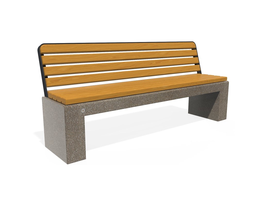 Lavice s opěradlem vyrobená z vysoce odolného vyztuženého vláknobetonu a přírodního kameniva. Kamenivá konstrukce se skládá z přírodního mramoru nebo žuly, které lze kombinovat v různých barvách. Povrch je kompletně leštěný. Sedací plocha je vyrobena ze dřeva s certifikací FSC a přítomnost opěradla vytváří maximální pohodlí. Certifikované dřevo a beton jsou ošetřeny speciálním ochranným nátěrem, díky kterému je výrobek ještě odolnější vůči agresivním povětrnostním podmínkám. Designová kombinace obou materiálů je stylovým řešením pro každé město. Kovové komponenty tvořící sedák a opěradlo lavice jsou vyrobeny z nerezové oceli, stejně jako všechny spojovací prvky.