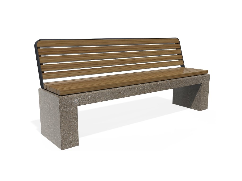 Lavice s opěradlem vyrobená z vysoce odolného vyztuženého vláknobetonu a přírodního kameniva. Kamenivá konstrukce se skládá z přírodního mramoru nebo žuly, které lze kombinovat v různých barvách. Povrch je kompletně leštěný. Sedací plocha je vyrobena ze dřeva s certifikací FSC a přítomnost opěradla vytváří maximální pohodlí. Certifikované dřevo a beton jsou ošetřeny speciálním ochranným nátěrem, díky kterému je výrobek ještě odolnější vůči agresivním povětrnostním podmínkám. Designová kombinace obou materiálů je stylovým řešením pro každé město. Kovové komponenty tvořící sedák a opěradlo lavice jsou vyrobeny z nerezové oceli, stejně jako všechny spojovací prvky.