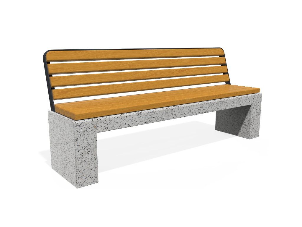 Lavice s opěradlem vyrobená z vysoce odolného vyztuženého vláknobetonu a přírodního kameniva. Kamenivá konstrukce se skládá z přírodního mramoru nebo žuly, které lze kombinovat v různých barvách. Povrch je kompletně leštěný. Sedací plocha je vyrobena ze dřeva s certifikací FSC a přítomnost opěradla vytváří maximální pohodlí. Certifikované dřevo a beton jsou ošetřeny speciálním ochranným nátěrem, díky kterému je výrobek ještě odolnější vůči agresivním povětrnostním podmínkám. Designová kombinace obou materiálů je stylovým řešením pro každé město. Kovové komponenty tvořící sedák a opěradlo lavice jsou vyrobeny z nerezové oceli, stejně jako všechny spojovací prvky.