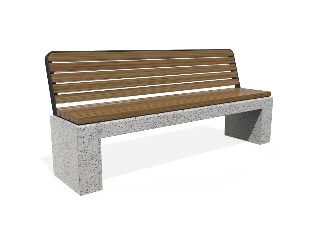 Lavice s opěradlem vyrobená z vysoce odolného vyztuženého vláknobetonu a přírodního kameniva. Kamenivá konstrukce se skládá z přírodního mramoru nebo žuly, které lze kombinovat v různých barvách. Povrch je kompletně leštěný. Sedací plocha je vyrobena ze dřeva s certifikací FSC a přítomnost opěradla vytváří maximální pohodlí. Certifikované dřevo a beton jsou ošetřeny speciálním ochranným nátěrem, díky kterému je výrobek ještě odolnější vůči agresivním povětrnostním podmínkám. Designová kombinace obou materiálů je stylovým řešením pro každé město. Kovové komponenty tvořící sedák a opěradlo lavice jsou vyrobeny z nerezové oceli, stejně jako všechny spojovací prvky.
