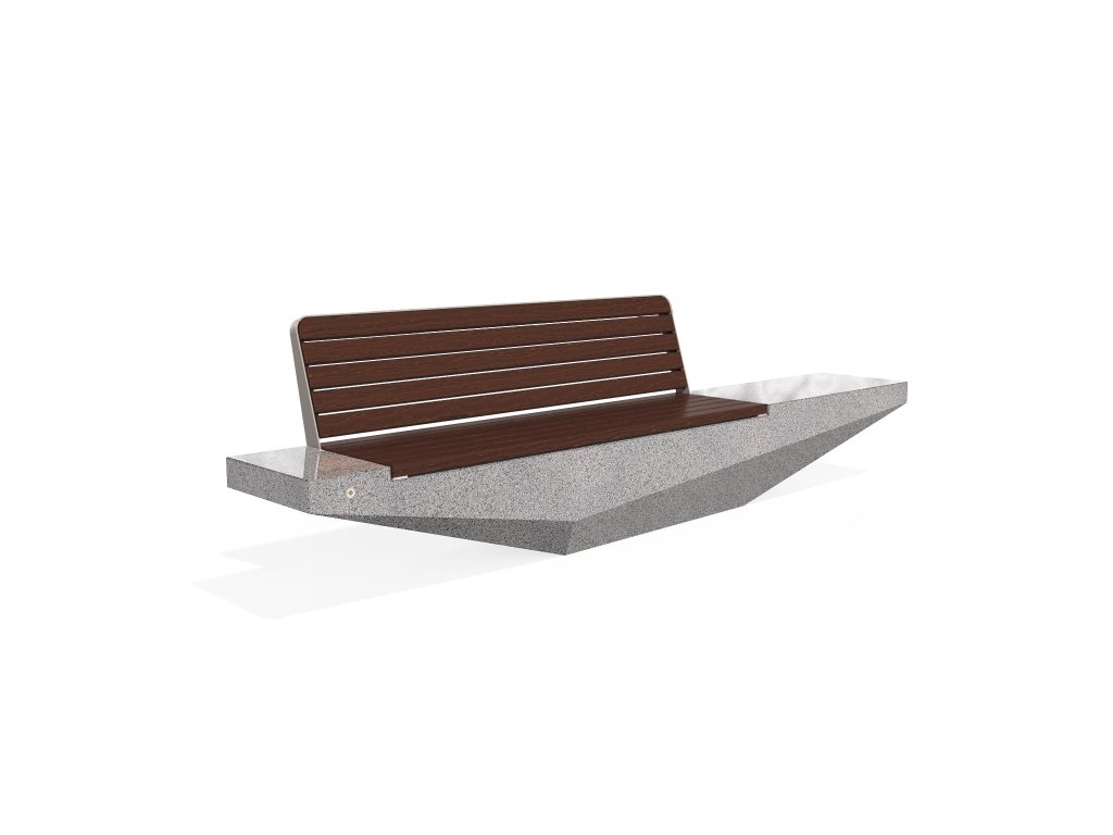 Lavice s opěradlem vyrobená z vysoce odolného betonu a dřeva. Beton má homogenní strukturu kameniva, je vyztužen a zpevněn vlákny. Struktura kameniva je vyrobena z přírodního mramoru nebo žuly. Kameny mají specifickou velikost a lze je kombinovat v různých barvách. Povrch kameniva je jemně leštěn a vytváří pocit sametového doteku. Dodatečná úprava povrchů ochranným nátěrem činí výrobek ještě odolnějším vůči agresivním povětrnostním podmínkám a snižuje usazování nečistot. Kovové komponenty tvořící sedák a opěradlo lavice jsou vyrobeny z nerezové oceli. Sedací plocha a opěradlo jsou navrženy ve speciálně vypočítaném úhlu pro dosažení ergonomie a maximálního pohodlí. Stylové designové řešení, které se opírá o proporce a rovnováhu mezi dvěma různými materiály. Lavice je moderní dekorací městského exteriéru a pečlivě vybrané certifikované dřevo nás přibližuje k přírodě.