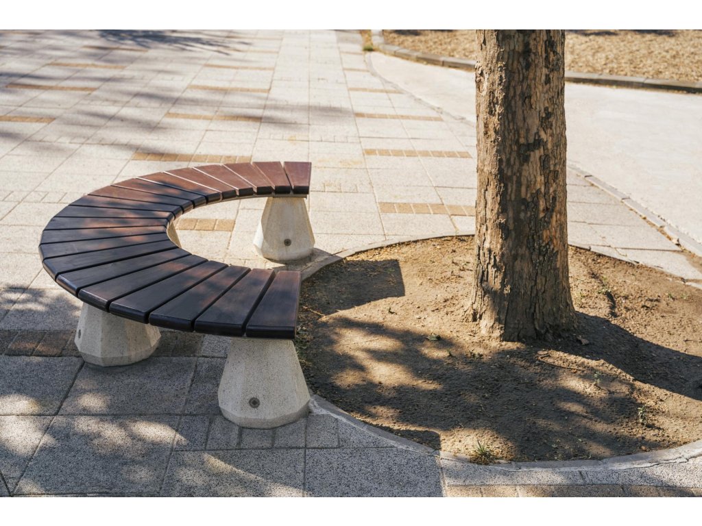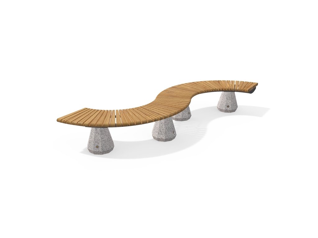 Modulární lavička kombinující vysoce odolný beton, kovovou konstrukci a certifikované dřevo. Betonové nohy mají reliéfní povrch z přírodního kameniva.