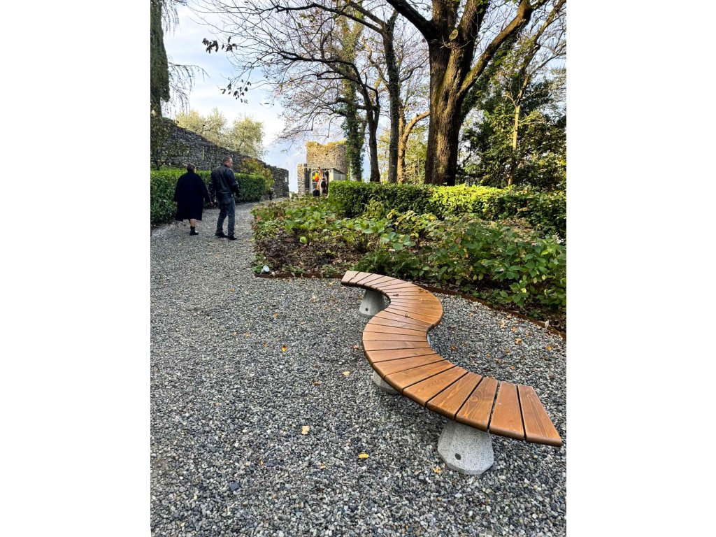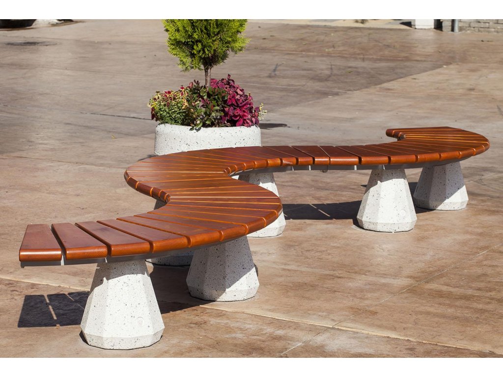 Modulární lavička kombinující vysoce odolný beton, kovovou konstrukci a certifikované dřevo. Betonové nohy mají reliéfní povrch z přírodního kameniva.