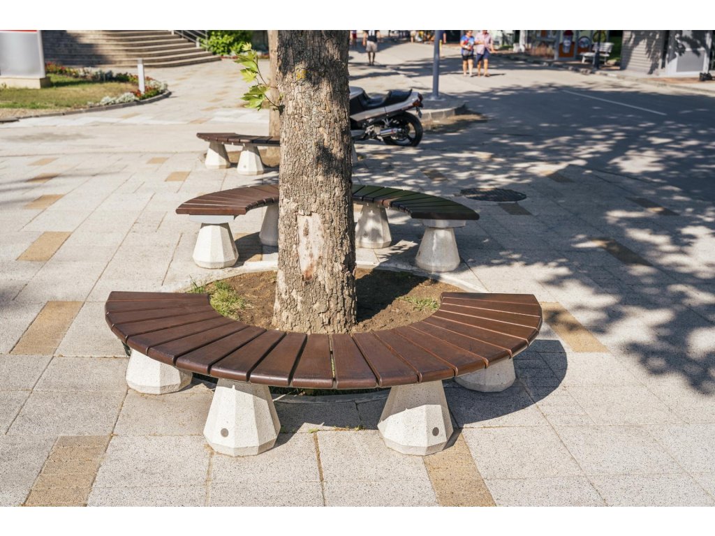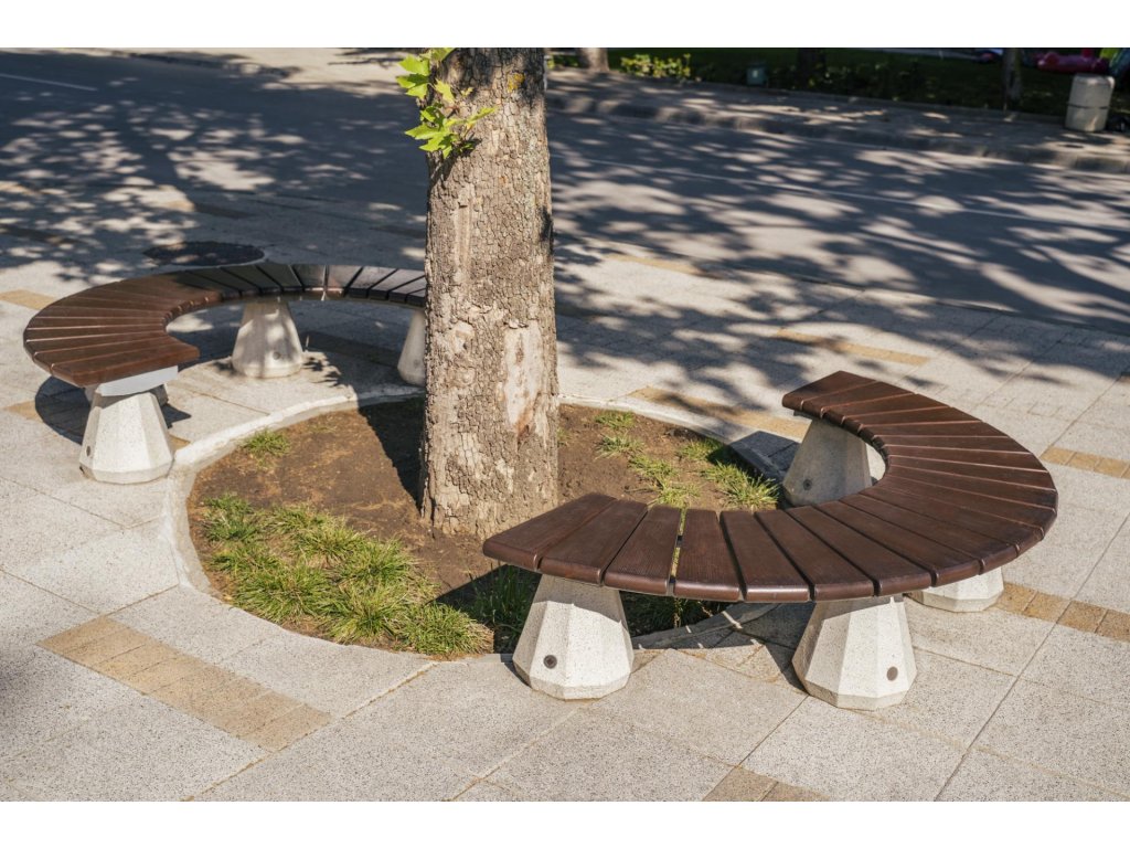 Modulární lavička kombinující vysoce odolný beton, kovovou konstrukci a certifikované dřevo. Betonové nohy mají reliéfní povrch z přírodního kameniva.