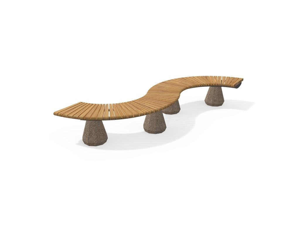Modulární lavička kombinující vysoce odolný beton, kovovou konstrukci a certifikované dřevo. Betonové nohy mají reliéfní povrch z přírodního kameniva.