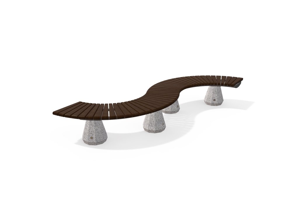 Modulární lavička kombinující vysoce odolný beton, kovovou konstrukci a certifikované dřevo. Betonové nohy mají reliéfní povrch z přírodního kameniva.