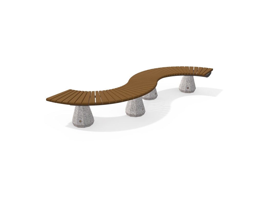 Modulární lavička kombinující vysoce odolný beton, kovovou konstrukci a certifikované dřevo. Betonové nohy mají reliéfní povrch z přírodního kameniva.