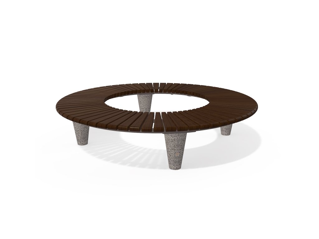 Kulatá lavička kombinující vysoce odolný beton, kovovou konstrukci a certifikované dřevo. Betonové nohy mají reliéfní povrch z přírodního kameniva.