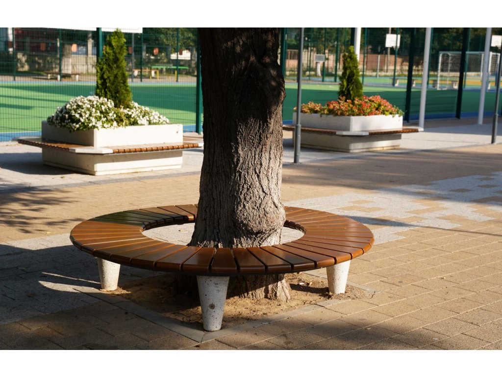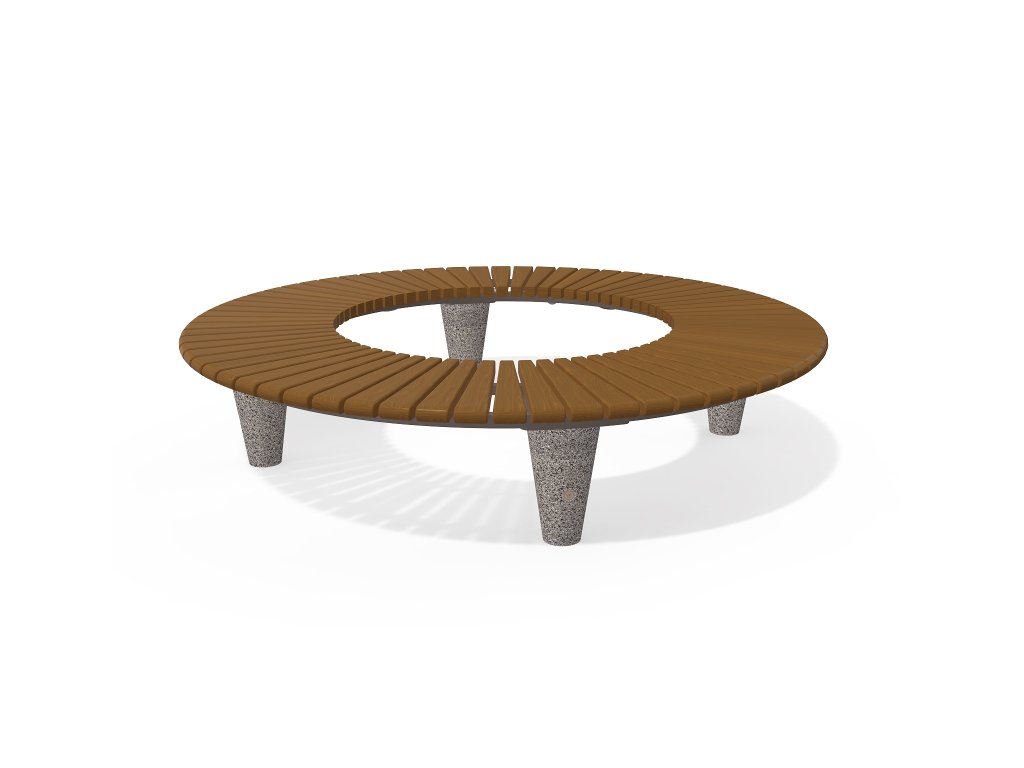 Kulatá lavička kombinující vysoce odolný beton, kovovou konstrukci a certifikované dřevo. Betonové nohy mají reliéfní povrch z přírodního kameniva.