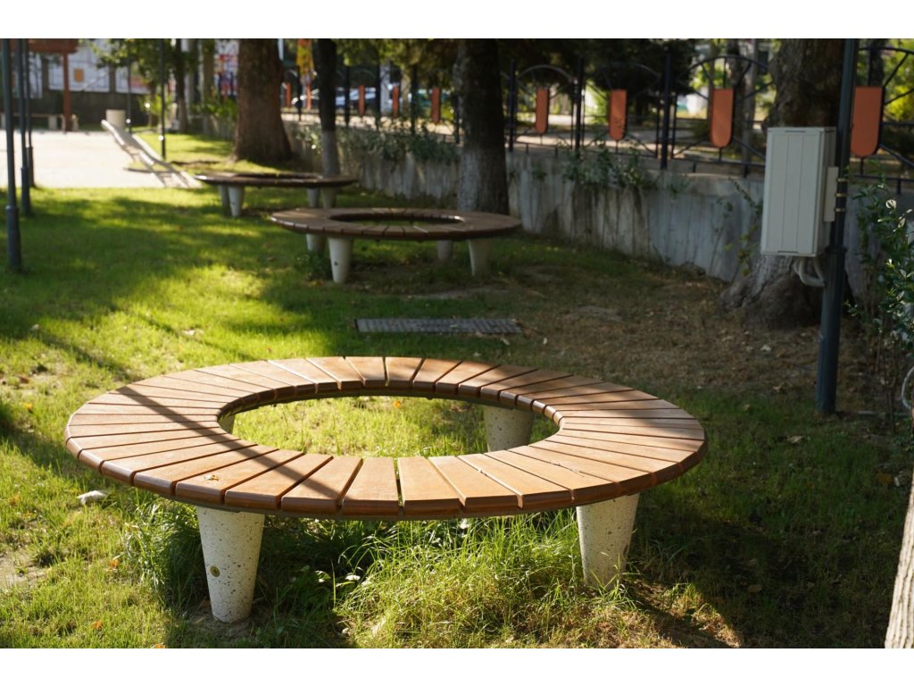 Kulatá lavička kombinující vysoce odolný beton, kovovou konstrukci a certifikované dřevo. Betonové nohy mají reliéfní povrch z přírodního kameniva. Konstrukce je vyrobena z mramoru nebo žulových kamenů definované velikosti v různých barevných kombinacích. Kovová konstrukce je galvanicky pozinkovaná a práškově lakovaná. Tyto technologické metody chrání kov před korozí a zvyšují jeho výkon. Pro kulatou lavičku 151 jsou k dispozici dva certifikované druhy dřeva – smrkové měkké dřevo a exotické tvrdé bambusové dřevo. Beton a prkna jsou dále ošetřeny ochranným nátěrem, díky kterému je výrobek ještě odolnější vůči agresivním atmosférickým podmínkám. Prvky spojující jednotlivé konstrukce jsou z nerezové oceli. Originalita designového rozhodnutí se skrývá v sémantice kruhu – nejstarším pojmu estetiky. Kruhová lavička může být obejmutím pro jakýkoli strom v parku a akcentem v moderních prostorách.