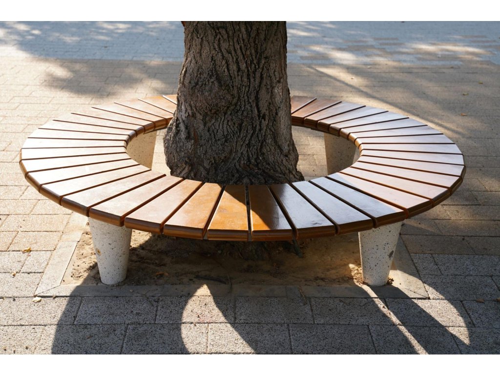 Kulatá lavička kombinující vysoce odolný beton, kovovou konstrukci a certifikované dřevo. Betonové nohy mají reliéfní povrch z přírodního kameniva.