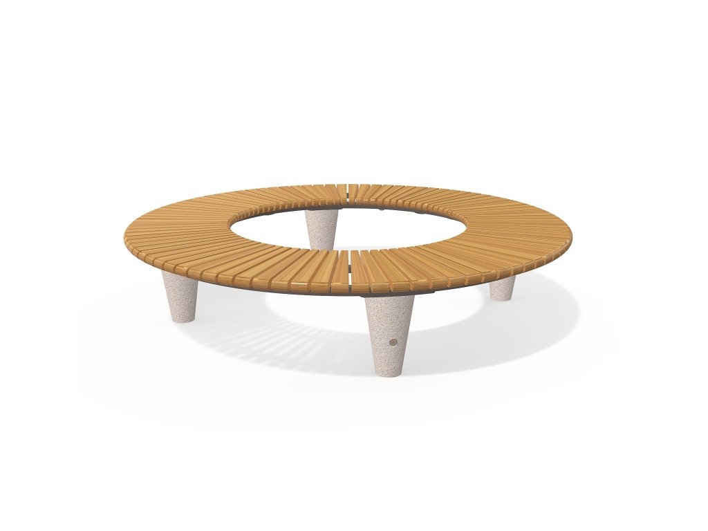 Kulatá lavička kombinující vysoce odolný beton, kovovou konstrukci a certifikované dřevo. Betonové nohy mají reliéfní povrch z přírodního kameniva.