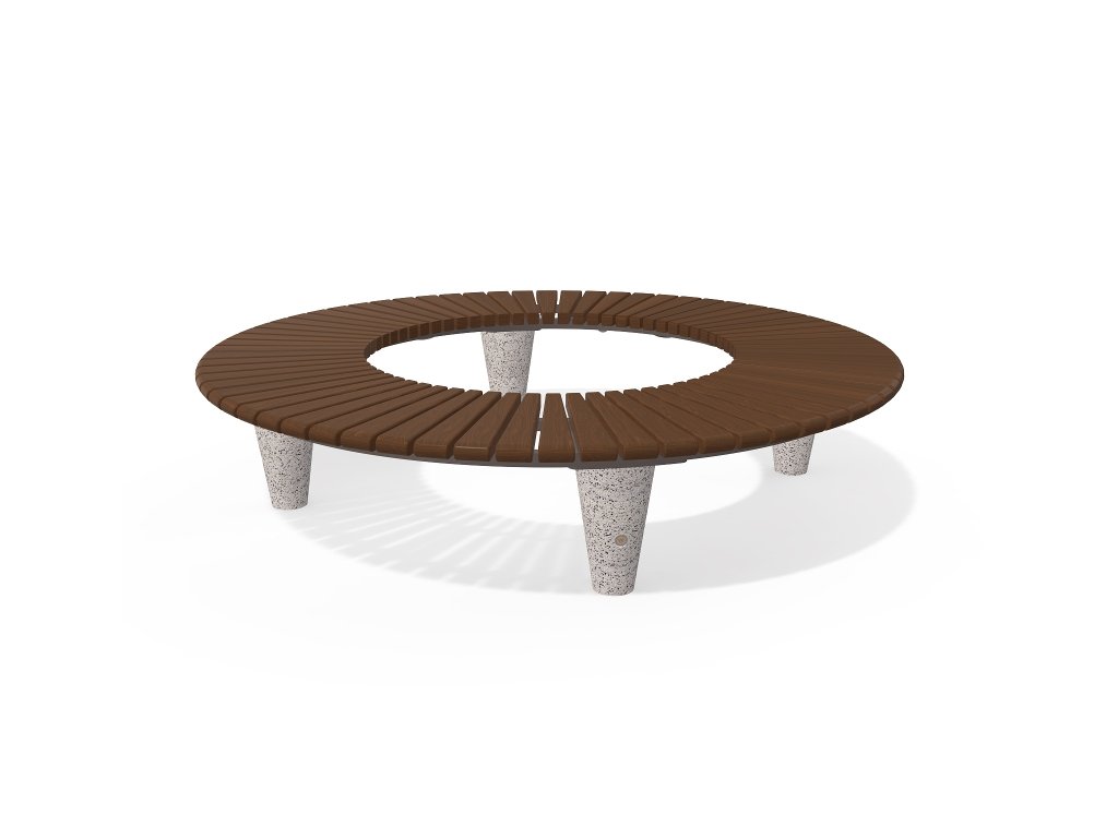 Kulatá lavička kombinující vysoce odolný beton, kovovou konstrukci a certifikované dřevo. Betonové nohy mají reliéfní povrch z přírodního kameniva.