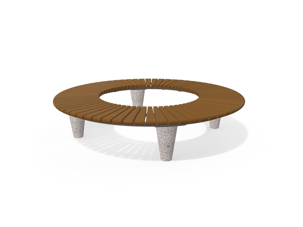 Kulatá lavička kombinující vysoce odolný beton, kovovou konstrukci a certifikované dřevo. Betonové nohy mají reliéfní povrch z přírodního kameniva.