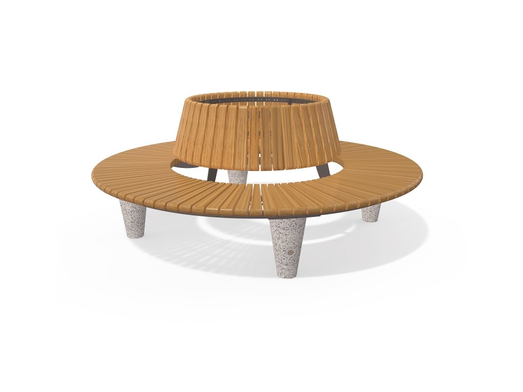 Kulatá lavička s opěradlem vyrobená z vysoce odolného betonu, kovové konstrukce a certifikovaného dřeva. Varianta modelu 151, která dodává dřevěnému opěradlu extra komfort s ohledem na ergonomii těla.