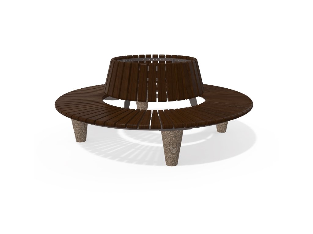 Kulatá lavička s opěradlem vyrobená z vysoce odolného betonu, kovové konstrukce a certifikovaného dřeva. Varianta modelu 151, která dodává dřevěnému opěradlu extra komfort s ohledem na ergonomii těla.