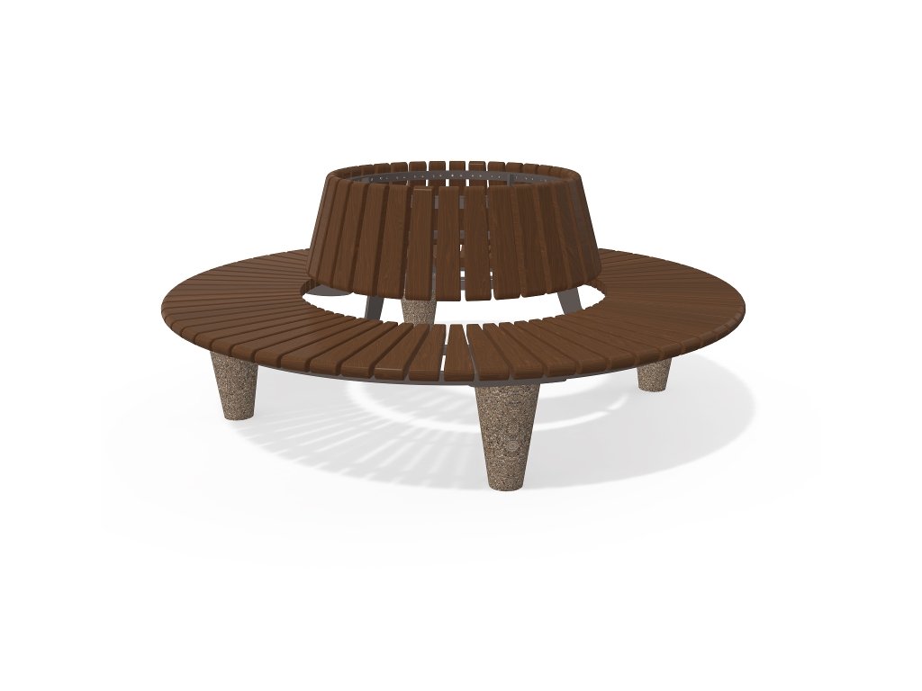 Kulatá lavička s opěradlem vyrobená z vysoce odolného betonu, kovové konstrukce a certifikovaného dřeva. Varianta modelu 151, která dodává dřevěnému opěradlu extra komfort s ohledem na ergonomii těla.