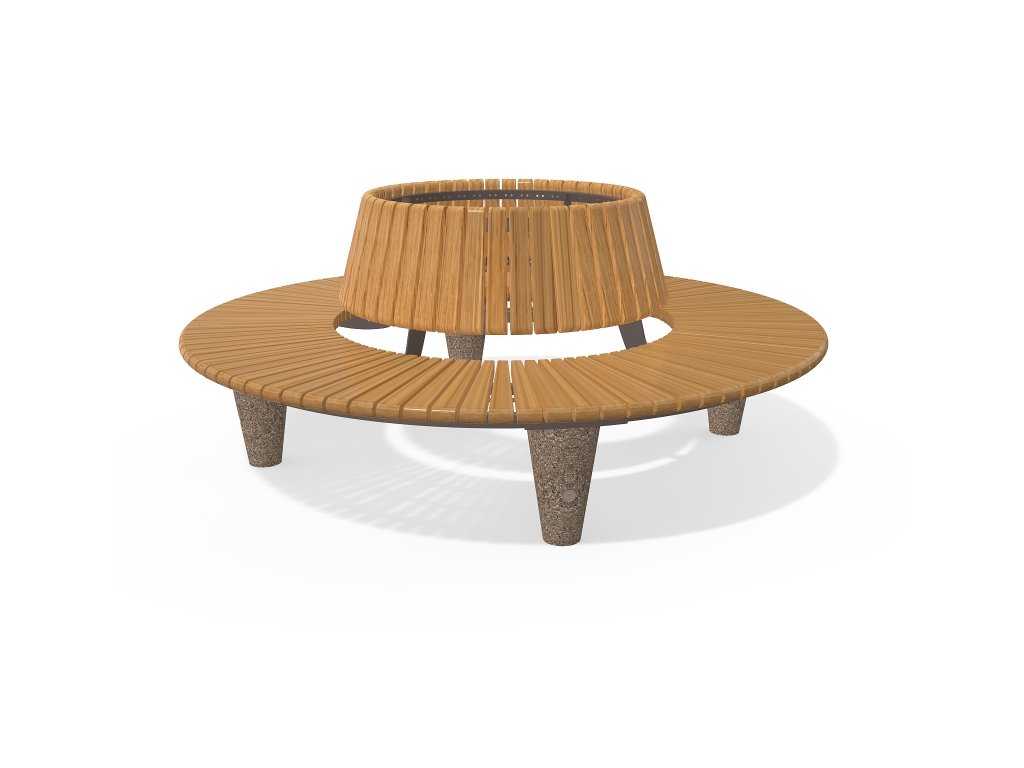 Kulatá lavička s opěradlem vyrobená z vysoce odolného betonu, kovové konstrukce a certifikovaného dřeva. Varianta modelu 151, která dodává dřevěnému opěradlu extra komfort s ohledem na ergonomii těla.