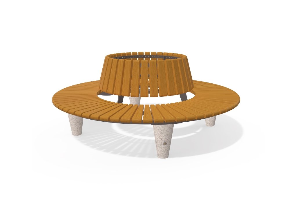 Kulatá lavička s opěradlem vyrobená z vysoce odolného betonu, kovové konstrukce a certifikovaného dřeva. Varianta modelu 151, která dodává dřevěnému opěradlu extra komfort s ohledem na ergonomii těla.