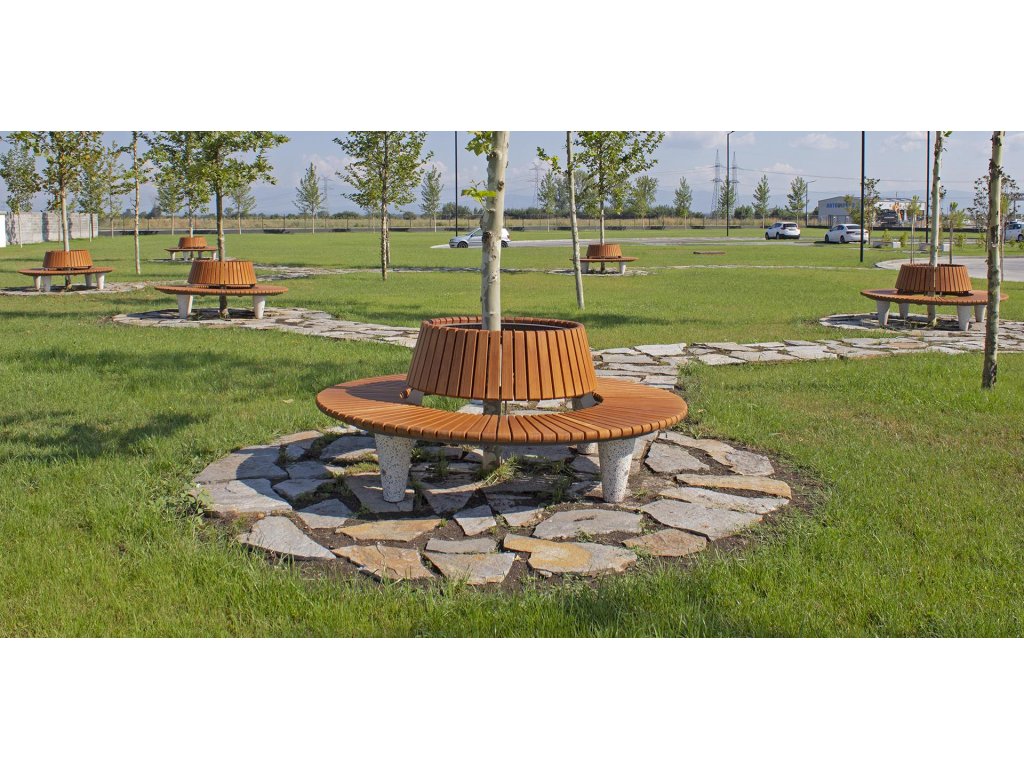 Kulatá lavička s opěradlem vyrobená z vysoce odolného betonu, kovové konstrukce a certifikovaného dřeva. Varianta modelu 151, která dodává dřevěnému opěradlu extra komfort s ohledem na ergonomii těla.