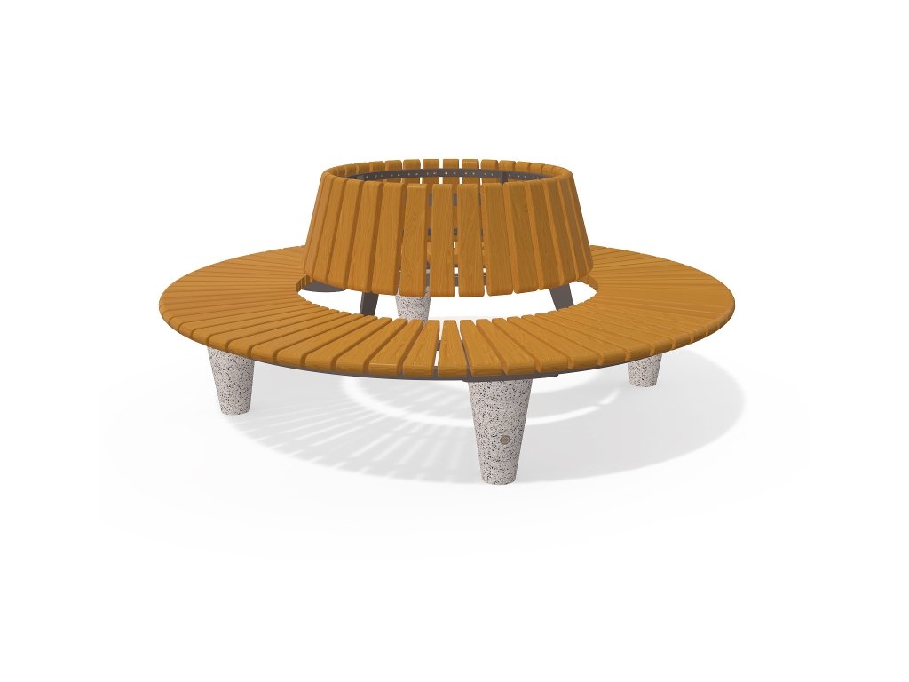 Kulatá lavička s opěradlem vyrobená z vysoce odolného betonu, kovové konstrukce a certifikovaného dřeva. Varianta modelu 151, která dodává dřevěnému opěradlu extra komfort s ohledem na ergonomii těla.