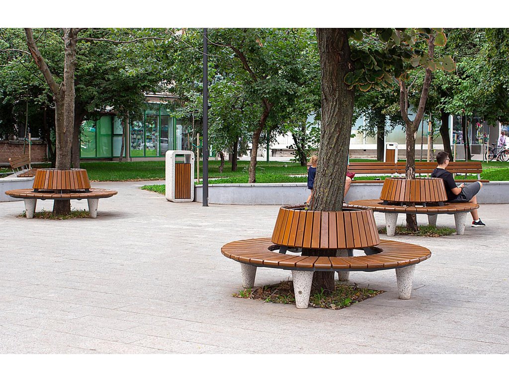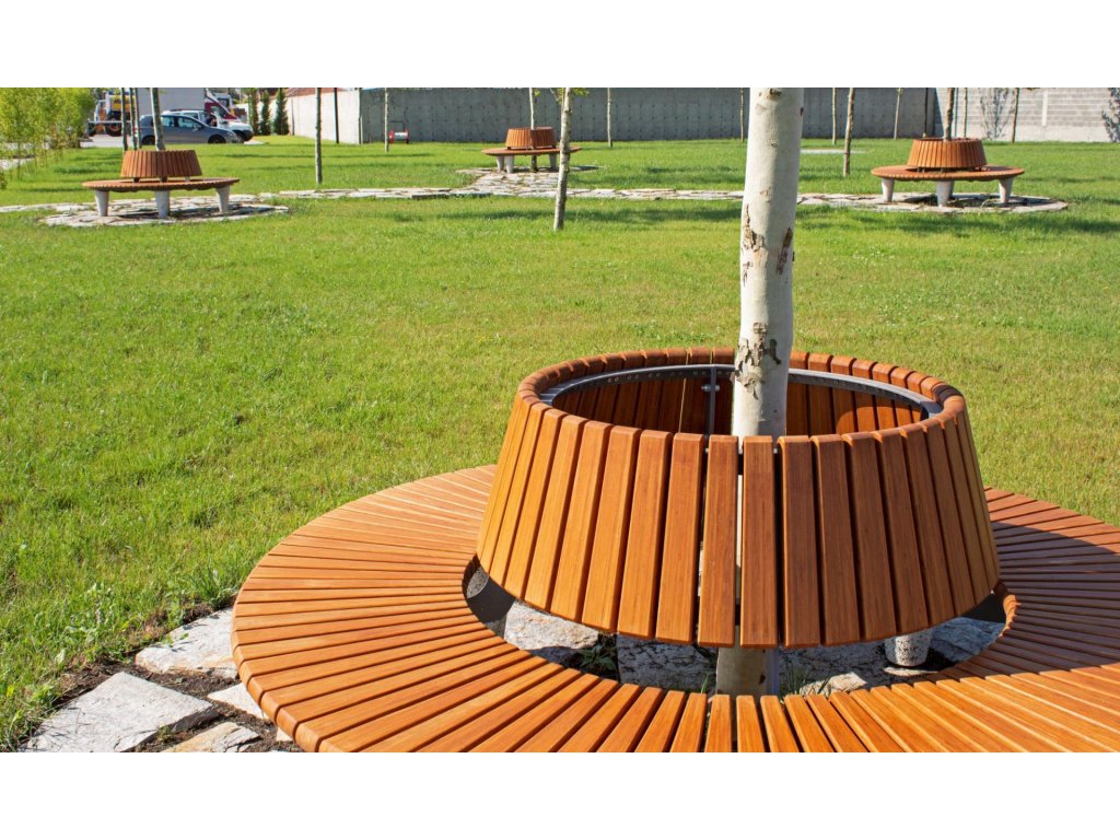 Kulatá lavička s opěradlem vyrobená z vysoce odolného betonu, kovové konstrukce a certifikovaného dřeva. Varianta modelu 151, která dodává dřevěnému opěradlu extra komfort s ohledem na ergonomii těla.