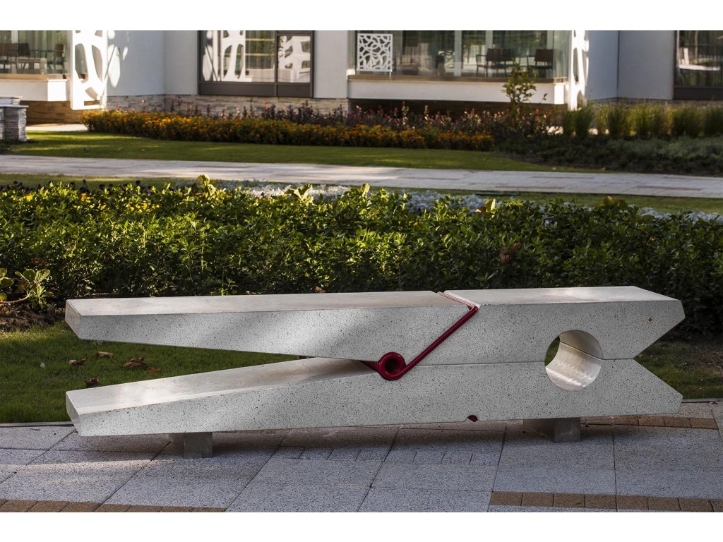 Betonová lavička s chytlavým designem ve tvaru kolíčku na prádlo má kompletně leštěný povrch. Je vyrobena z vysoce odolného vláknobetonu a přírodního kameniva.