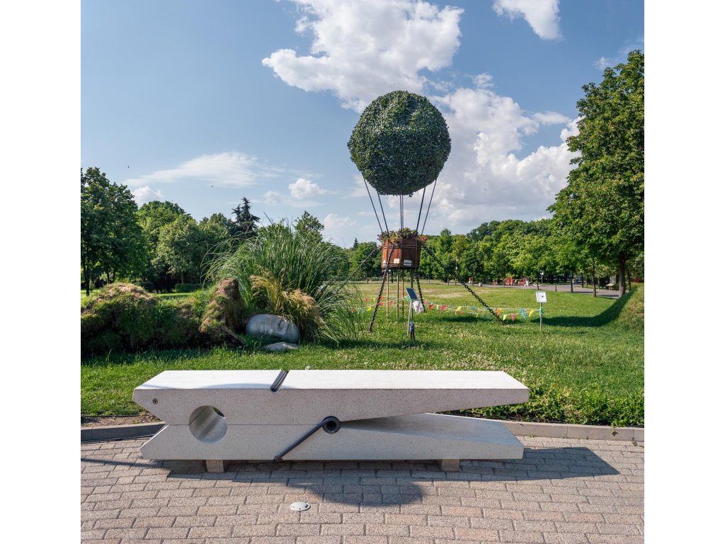 Betonová lavička s chytlavým designem ve tvaru kolíčku na prádlo má kompletně leštěný povrch. Je vyrobena z vysoce odolného vláknobetonu a přírodního kameniva. Struktura kameniva se skládá z přírodních, drcených mramorových nebo žulových kamenů přesně definované velikosti a nabízí možnost různých barevných kombinací. Povrch je dále ošetřen ochranným nátěrem, díky kterému je výrobek ještě odolnější vůči agresivním povětrnostním vlivům. Pružina je vyrobena z oceli s vysoce kvalitním antikorozním práškovým lakováním ve výběru barev.