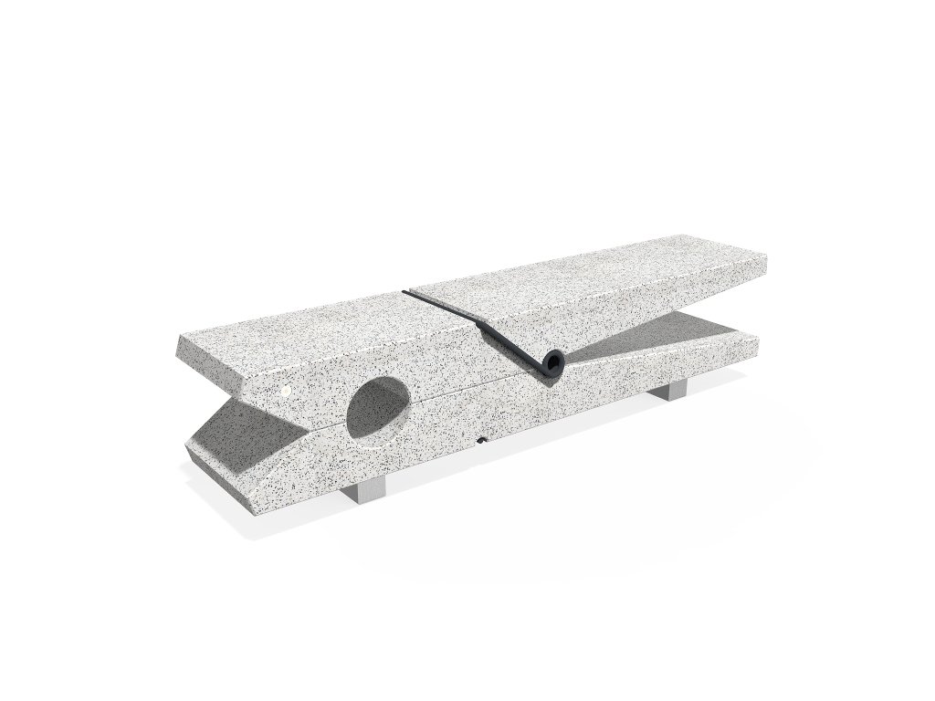 Betonová lavička s chytlavým designem ve tvaru kolíčku na prádlo má kompletně leštěný povrch. Je vyrobena z vysoce odolného vláknobetonu a přírodního kameniva. Struktura kameniva se skládá z přírodních, drcených mramorových nebo žulových kamenů přesně definované velikosti a nabízí možnost různých barevných kombinací. Povrch je dále ošetřen ochranným nátěrem, díky kterému je výrobek ještě odolnější vůči agresivním povětrnostním vlivům. Pružina je vyrobena z oceli s vysoce kvalitním antikorozním práškovým lakováním ve výběru barev.